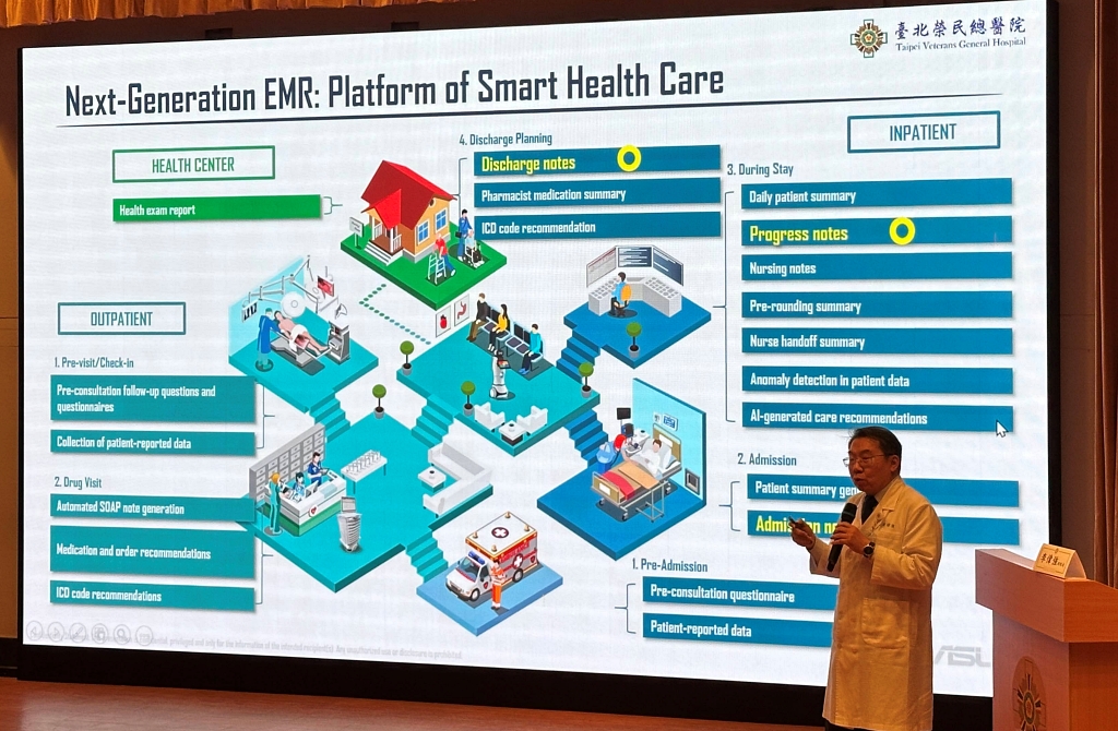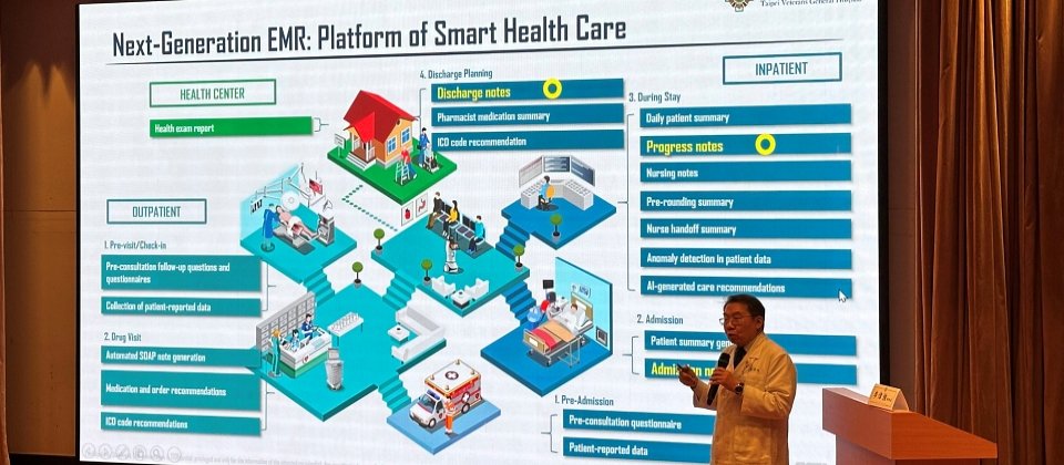 而要AI真正落地,核心仍是電子病歷系統架構。臺北榮總與業者正開發一套次世代電子病歷平臺,能串起病人的門診、住院、出院與返家照護等流程。例如在門診階段,病人可透過App預先填寫問卷,資料直接匯入系統,減少現場人工輸入時間,醫師也能在看診時能更快掌握重點。