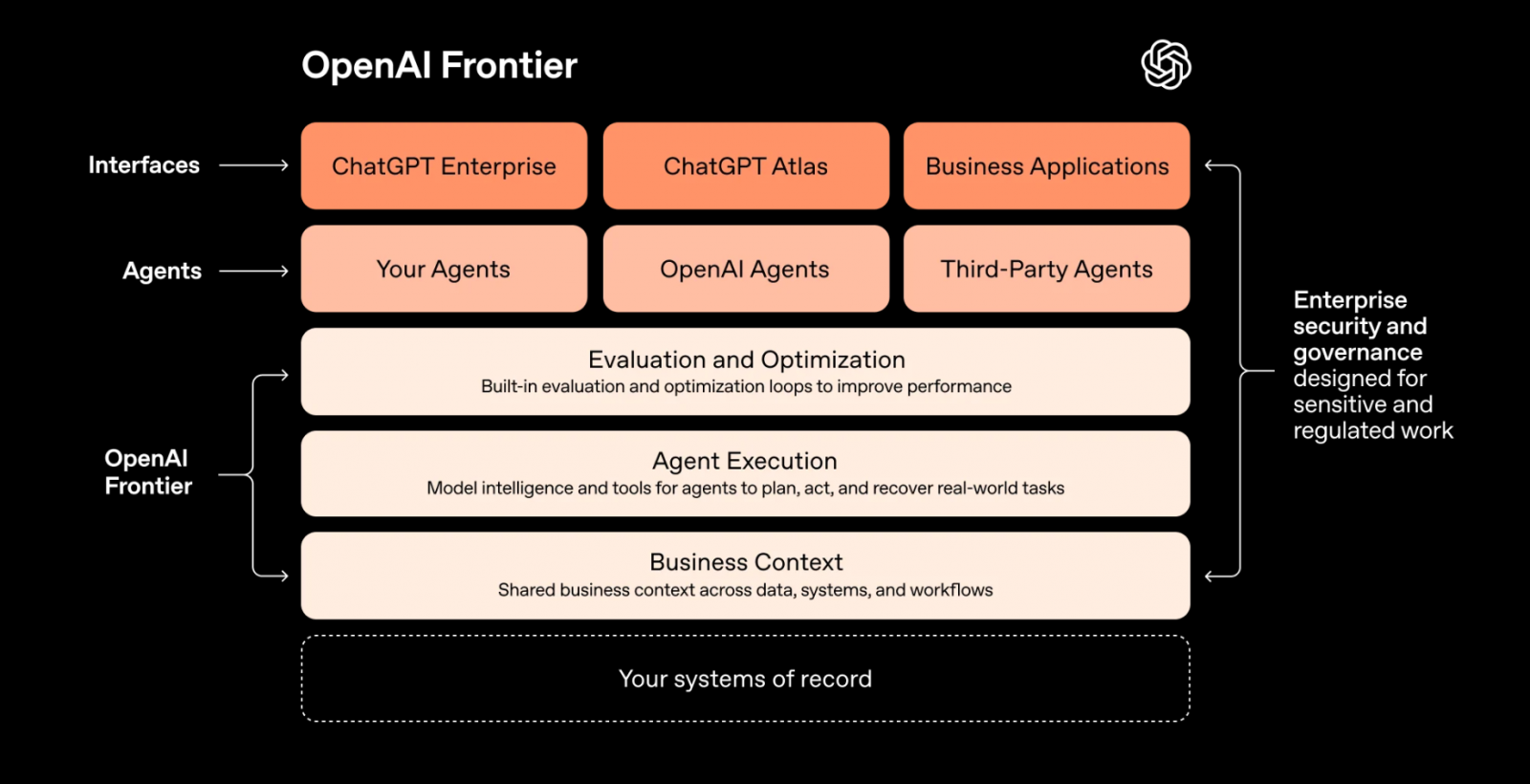 OpenAI指出,企業要真正提升生產力,關鍵不只是導入AI,而是建立跨系統的AI代理管理機制。Frontier可串接資料倉儲、CRM系統和內部應用,建立共用的「企業脈絡」,讓不同代理理解相同資料和任務背景。企業可透過ChatGPT Enterprise等介面操作Frontier,並同時管理自建、OpenAI提供的或第三方AI代理。