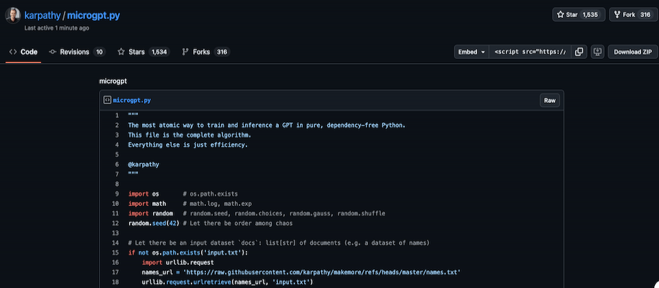 前OpenAI研究員、Eureka Labs創辦人Andrej Karpathy最近發起一個實驗專案microGPT,只用243行純Python程式碼、不依賴任何機器學習框架,就完整重現GPT語言模型的訓練與推論流程,把GPT的核心運作邏輯完整寫出來。他形容,GPT真正「不可或缺」的演算法就是這些,其他程式碼只是為了讓模型跑得更快、更有效率。他後來又再優化架構,進一步把程式碼精簡到200行。