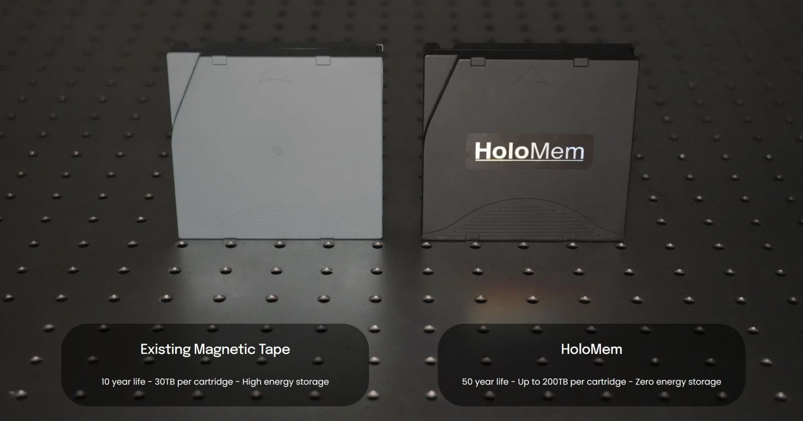 HoloMem的全像儲存匣採用與LTO磁帶匣相同的外型與構造,差異在於將磁帶更換為塗佈感光材料的PET塑膠儲存帶,不僅儲存密度更高,亦可承受攝氏零下40度至160度環境條件,理論壽命達50年以上。
