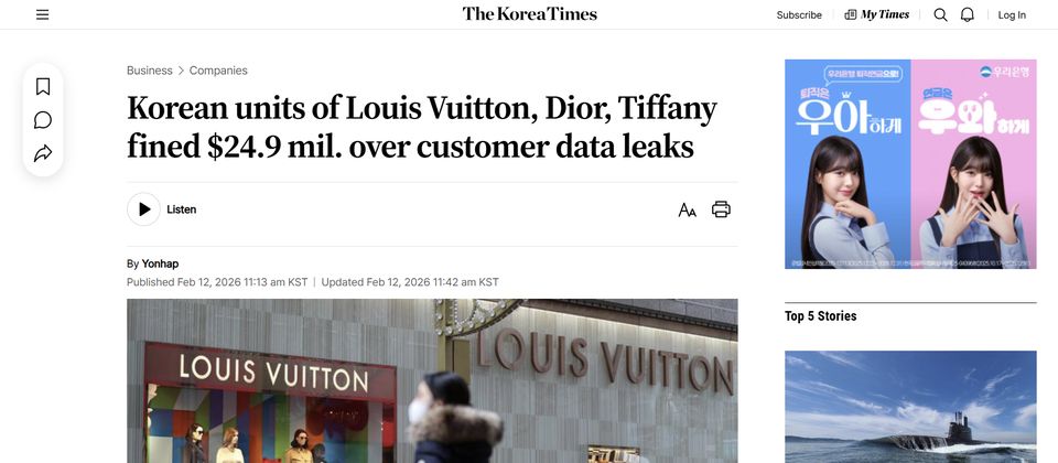南韓隱私主管機關上週基於2025年的雲端客戶資料庫大規模資料外洩事件,對同屬精品集團LVMH的三個品牌LV、Dior與Tiffany罰款超過360億韓元,約合2,500萬美元。