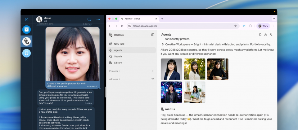 除了文字輸入,Manus Agents也支援語音訊息、圖片與文件。這項AI代理可自動轉錄語音內容並判讀意圖,並能針對照片進行編修或生成多個版本,例如,把使用者照片延伸成多種風格的大頭貼,也可依據產品圖片產出結構化的上市影片概念,包含分鏡想法與視覺方向,成果可直接在對話中交付,減少手動搬運檔案的步驟。