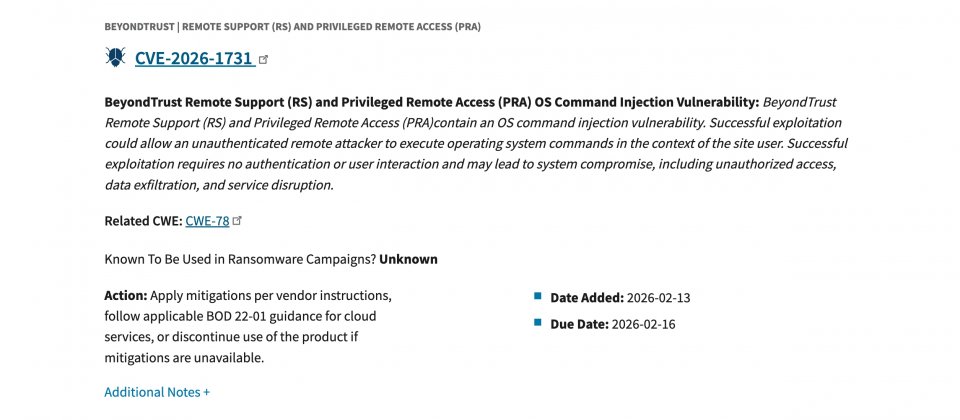 BeyondTrust旗下企業遠端支援產品Remote Support(RS)與Privileged Remote Access(PRA)被揭露存在嚴重的作業系統命令注入漏洞CVE-2026-1731,CVSS評分高達9.9分。攻擊者無需任何身分驗證,也不需要使用者互動,即可對曝露於網際網路的目標設備遠端執行任意指令。美國網路安全暨基礎設施安全局(CISA)已將此漏洞列入已知遭利用漏洞(KEV)名單。