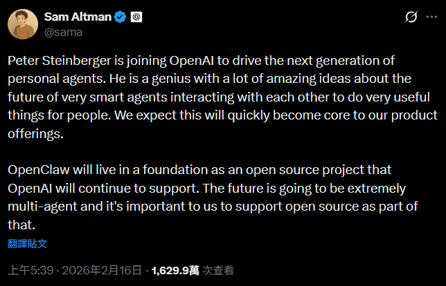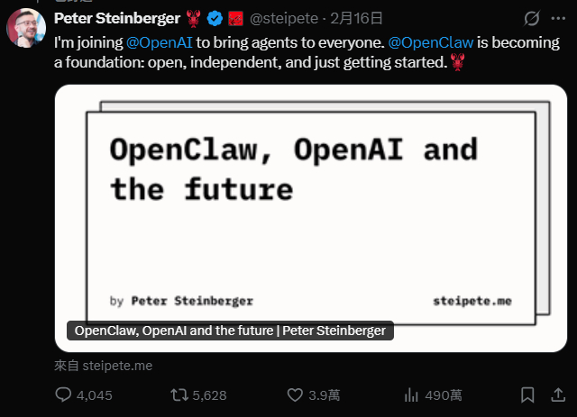 開發開源代理型AI系統的Peter Steinberger本周宣布加入OpenAI,而OpenClaw將以開源基金會形式存在,由OpenAI持續支援。
