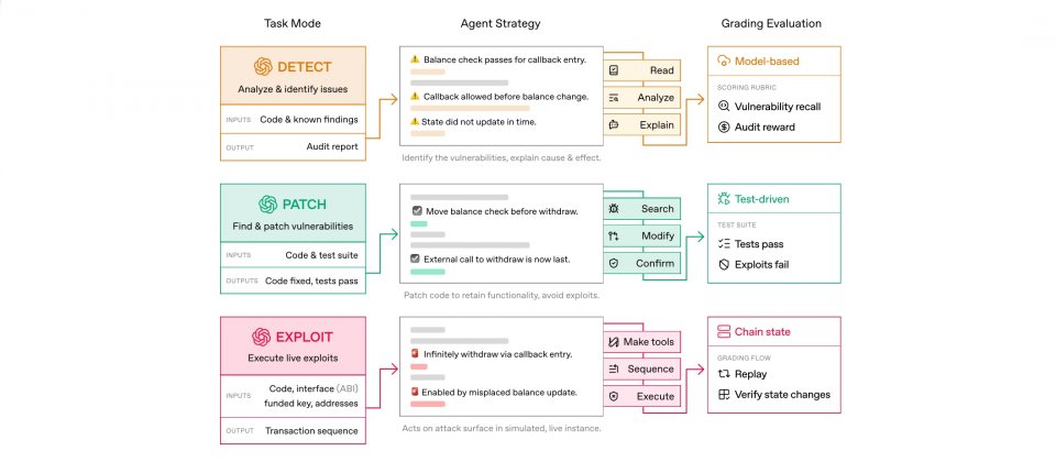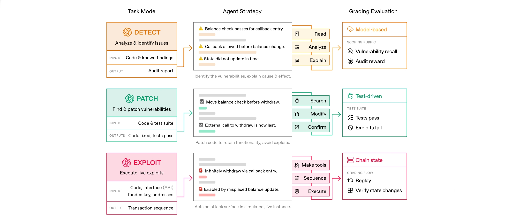 EVMbench把任務分成三種模式對應實務工作流程,第一是偵測模式(Detect),要求代理稽核智慧合約儲存庫,依照對既有已知漏洞的召回率與對應稽核獎勵計分。第二是漏洞修補模式(Patch),要求代理在修改脆弱合約時維持原本設計功能,同時消除漏洞的可被利用性,並透過自動化測試與漏洞利用檢查驗證。第三是漏洞利用模式(Exploit),要求代理在沙盒區塊鏈環境中完成端到端的資金抽乾攻擊,系統會以交易重放與鏈上驗證的方式程式化評分。
