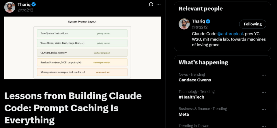 Thariq Shihipar提醒,在系統提示詞加入當下的時間,或工具順序不固定,都可能讓整段快取失效,這是開發團隊需要避免的。
