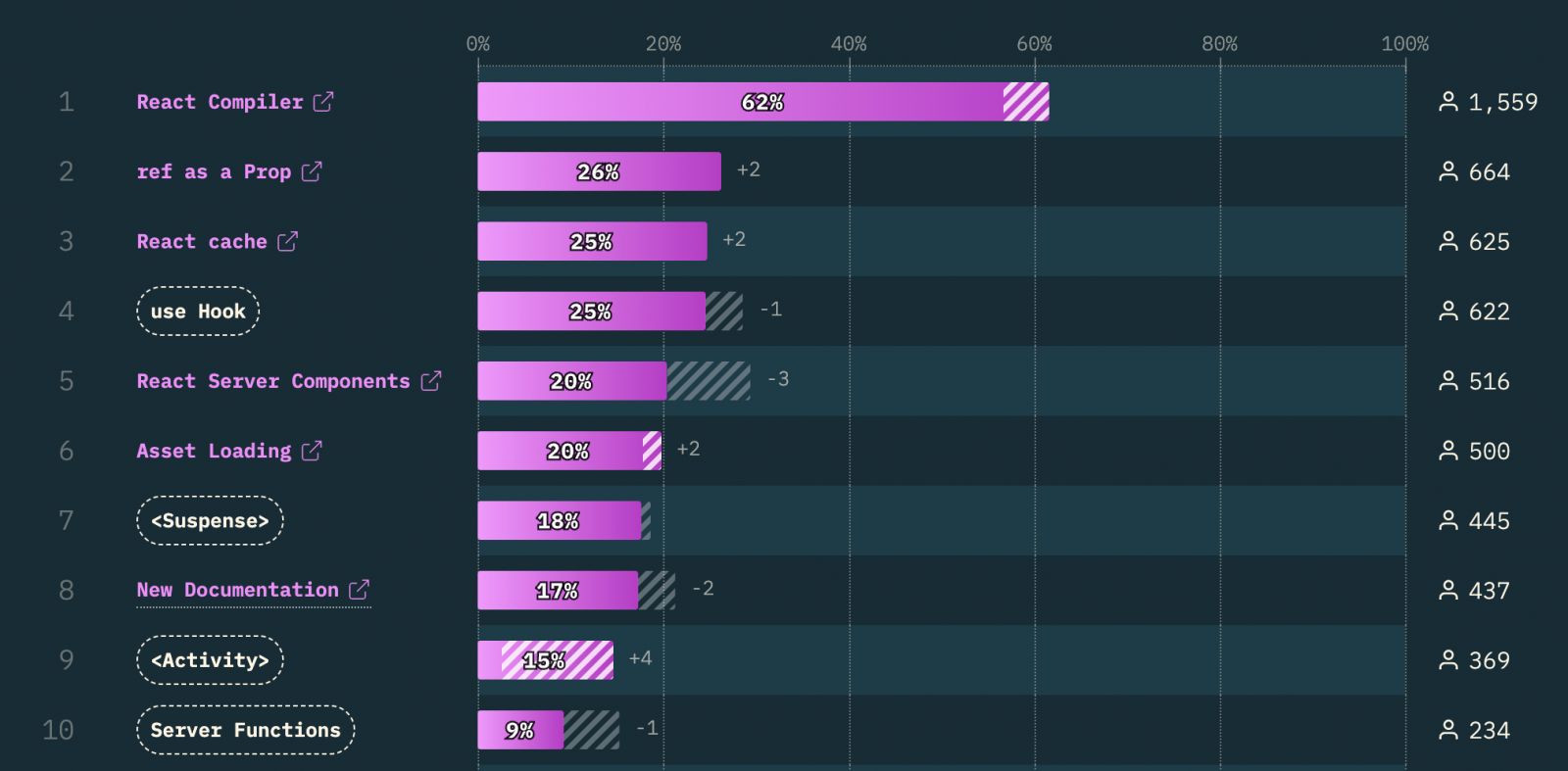 React Compiler是2025年官方在React Conf正式推出的功能,主打自動記憶化(Automatic Memoization),在編譯階段自動判斷可以重用的計算結果與回呼函式,減少手動加入效能最佳化操作,多數開發者對該功能態度正面。在新功能的採用度上,Suspense機制是目前採用率最高且滿意度也高的新功能。