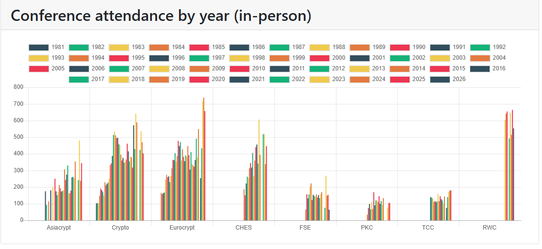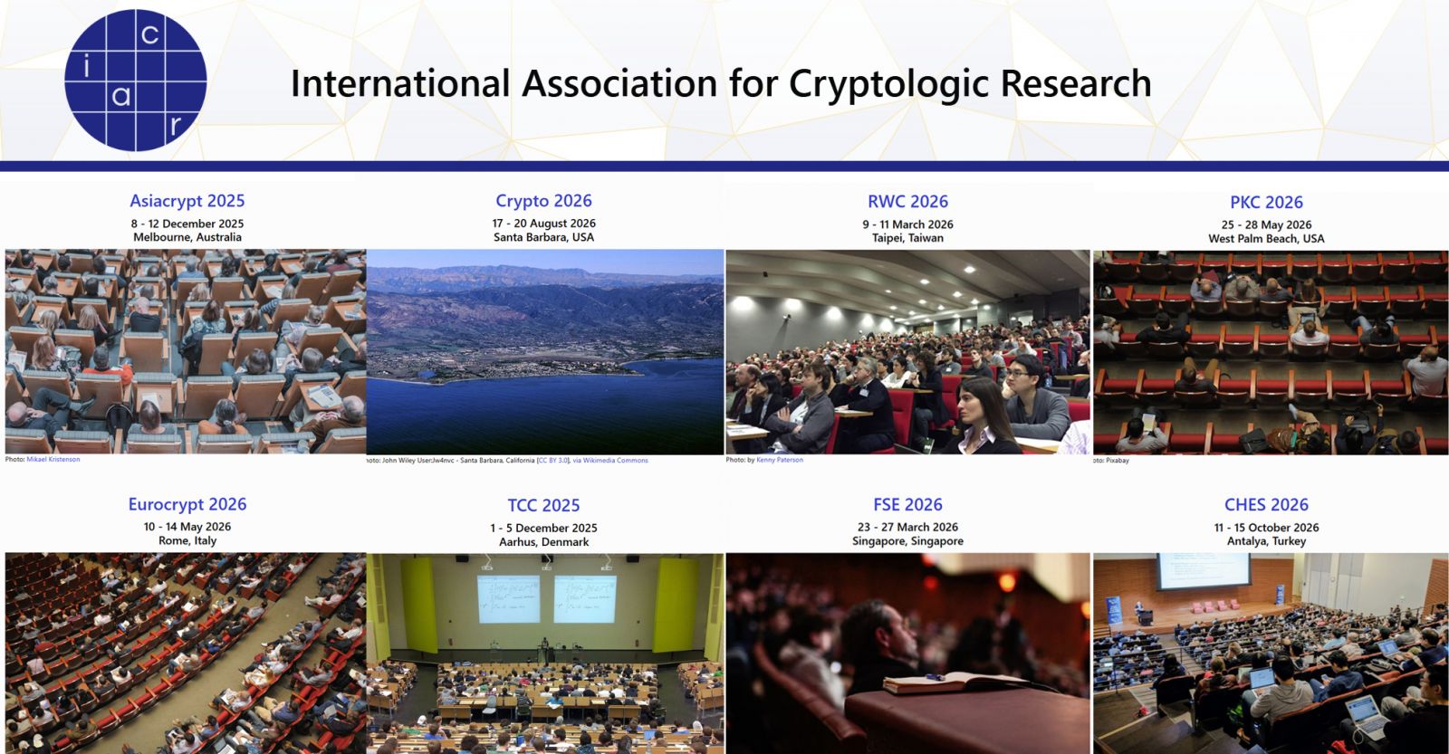 國際密碼研究學會(IACR)主辦的Crypto年會自1981年首屆舉辦以來,長期被公認為密碼學界最具影響力的年度盛事,該會議與其後創立的Eurocrypt 及Asiacrypt,並列為IACR體系下的三大旗艦會議。同時,IACR亦主辦CHES、FSE、PKC、TCC、RWC等重要密碼學會議。