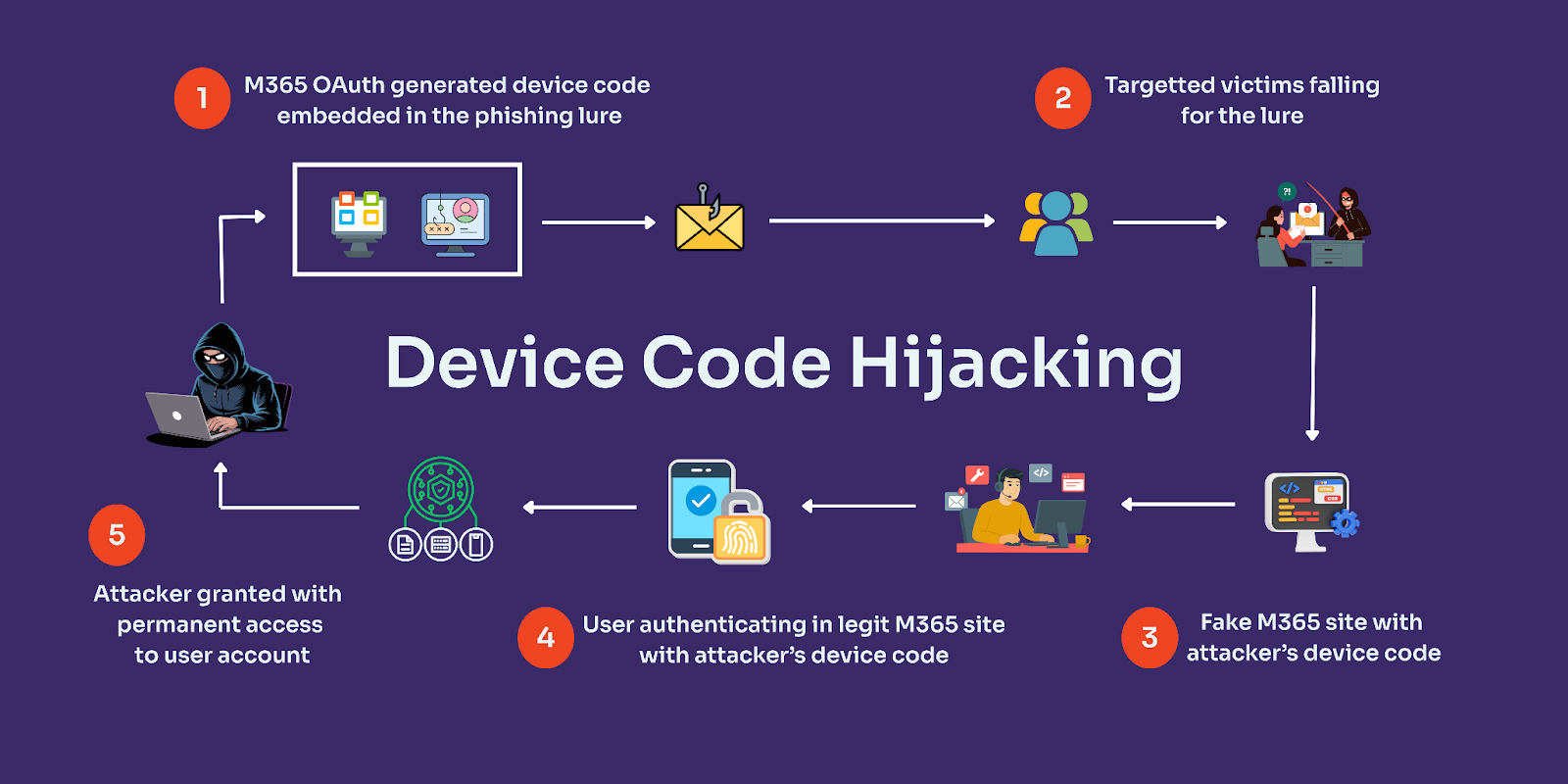 駭客事先利用開源工具產生裝置碼(device_code)與使用者驗證碼(user_code),並向目標用戶提供特定的OAuth應用程式,並說服他們透過微軟的裝置驗證網頁(microsoft.com/devicelogin)輸入使用者驗證碼,若是受害者依照系統指示輸入帳密及完成多因素驗證,攻擊者就能使用他們的單一登入應用程式與微軟的應用程式。為了後續能長期存取受害者Entra帳號,駭客可隨時透過裝置碼產生新的OAuth權杖,從而能在無須重新執行多因素驗證的流程下,繼續存取受害者的應用程式。