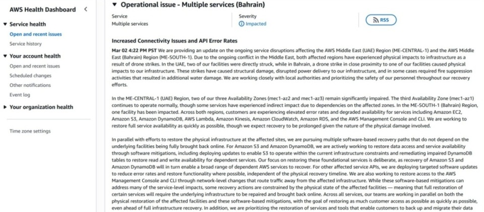 AWS在其服務狀態儀表板上指出,繼3月1日遭受中斷事故的阿拉伯聯合大公國me-central-1服務區域後,巴林的me-south-1服務區域也在3月2日發生服務中斷事故,已證實這兩個受影響區域的基礎設施,均因無人機襲擊而受損,建議用戶備份與遷移資料。