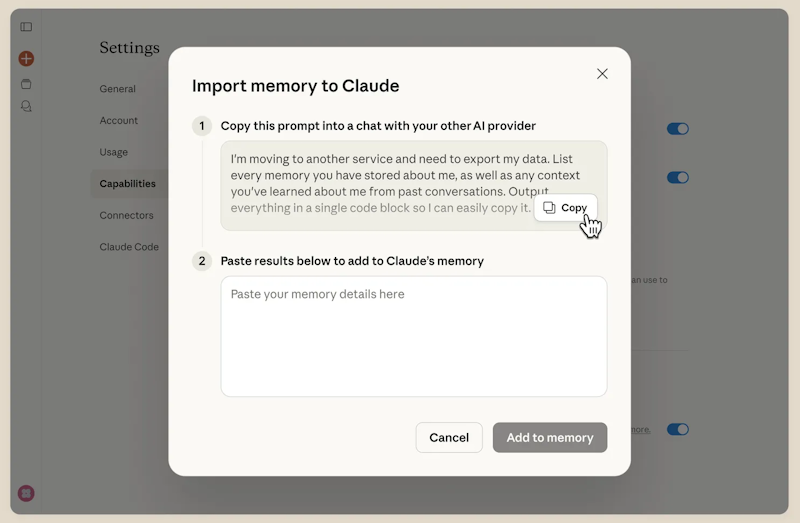 Anthropic並提供操作方法。首先,以自然語言提示從原有AI聊天機器人匯出記憶。Anthropic提供了一段提示讓使用者複製沿用、或客製修改。提示的重點是儘量保留原有字句、語調、格式;個資細節(姓名、地點、職稱、喜好、家人)、專案、目標、主題、使用的工具、語言和框架、用戶的偏好等。且要求它不要摘要、合併或遺漏任何對話。Anthropic並提醒用戶可以先匯出成Markdown檔方便儲存。