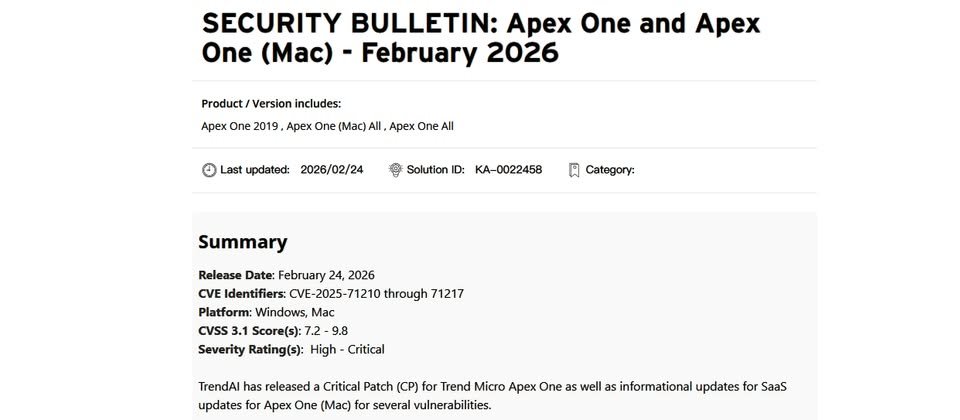 這些重大層級的漏洞被登記為CVE-2025-71210、CVE-2025-71211列管,趨勢僅提及攻擊者能用來上傳惡意程式碼,並遠端執行任何命令,CVSS風險評為9.8分(滿分10分),影響內部環境自行建置的Apex One、雲端服務型態的Apex One as a Service,以及Trend Vision One Endpoint Security - Standard Endpoint Protection,該公司表示他們已緩解SaaS版本的弱點,使用者無須自行套用緩解措施。