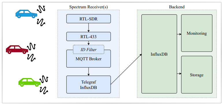 研究團隊在道路與停車場周邊架設5組低成本軟體定義無線電(Software-Defined Radio,SDR)設備,連續蒐集資料長達10週,共取得超過600萬筆TPMS訊號,涵蓋至少2萬輛車。另有12輛實際參與實驗的車輛,研究人員逐一核對其輪胎識別碼,以確認資料比對與車輛關聯分析的準確性。