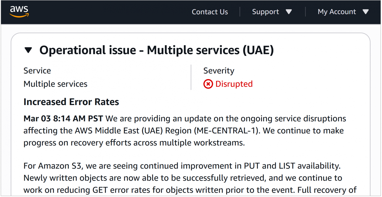 Amazon Web Services(AWS)周二(3/3)在健康儀表板(AWS Health Dashboard)上公告,中東地區軍事衝突已對其雲端基礎設施造成實體衝擊。阿拉伯聯合大公國(阿聯)的ME-CENTRAL-1區域資料中心遭無人機攻擊,導致多個可用區域(Availability Zone)的電力與網路中斷;巴林的ME-SOUTH-1區域則有一處資料中心設施因附近攻擊而受損,使多項雲端服務出現錯誤率上升與延遲。