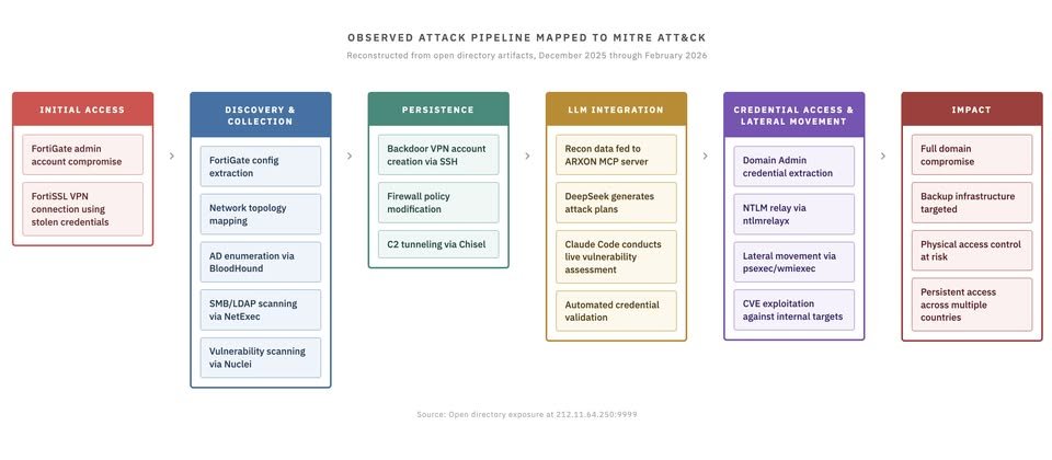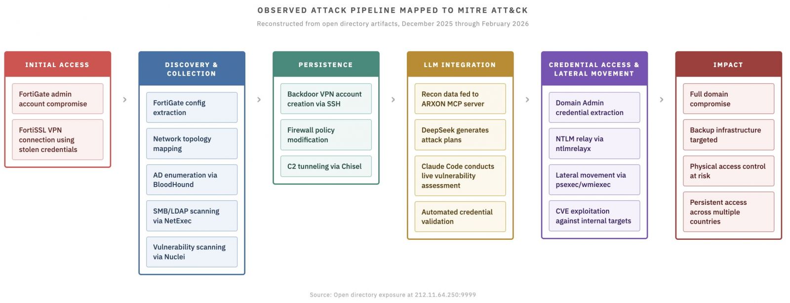 Amazon於2月下旬揭露鎖定Fortinet防火牆的大規模攻擊活動,駭客借助AI的力量,從1月上旬至2月初入侵超過600臺FortiGate裝置,後續資安威脅研究員Mike於部落格Cyber and Ramen進一步揭露,駭客使用DeepSeek分析偵察資料並產生攻擊計畫,並搭配Claude的程式碼助理打造攻擊工具並執行,但究竟整個攻擊流程如何運作?研究人員說明了相關細節。