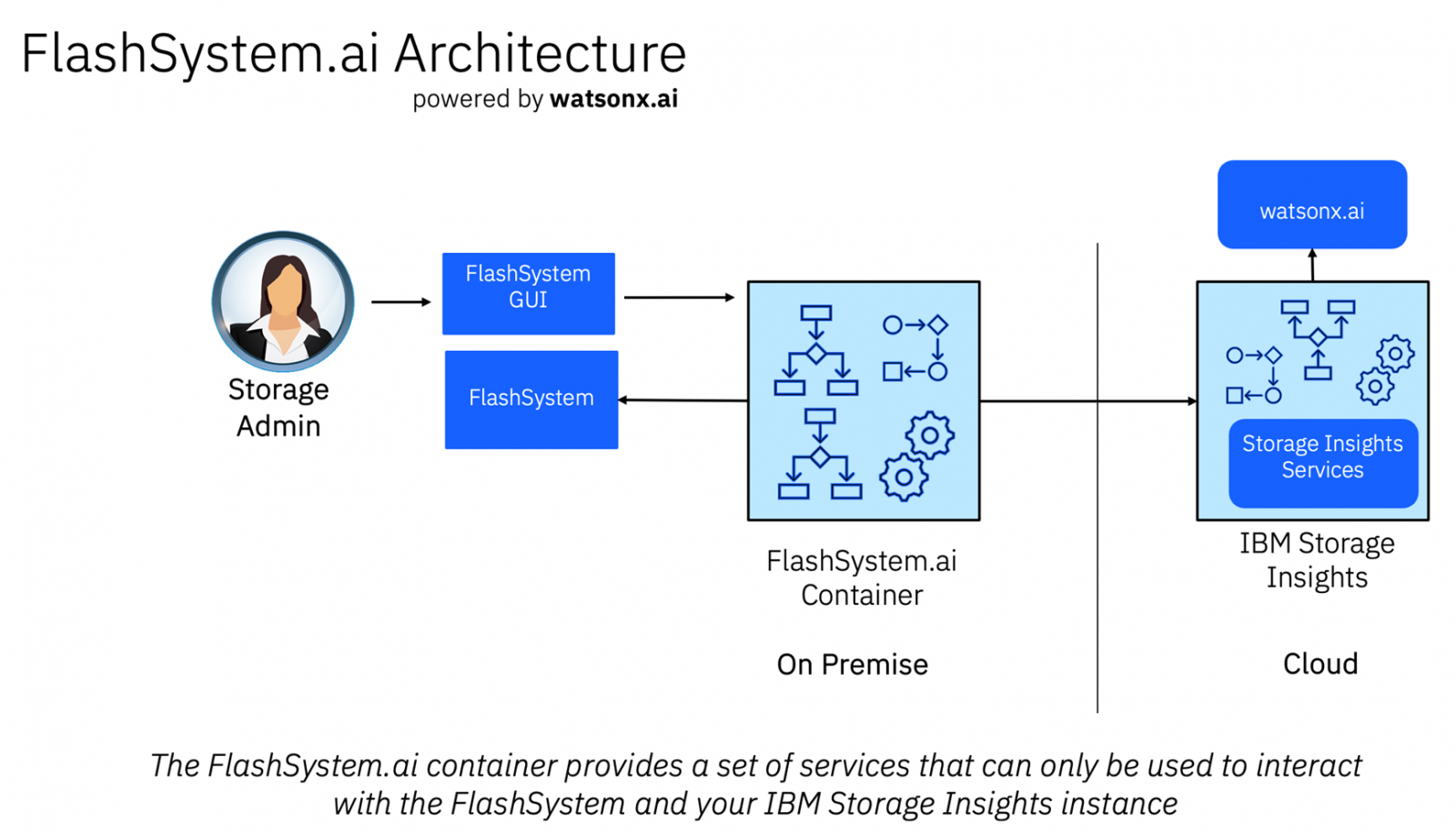 FlashSystem.ai以容器部署於用戶端儲存設備上,後端連結IBM的Storage Insights雲端管理平臺,在IBM watsonx.ai平臺的支援下運作。