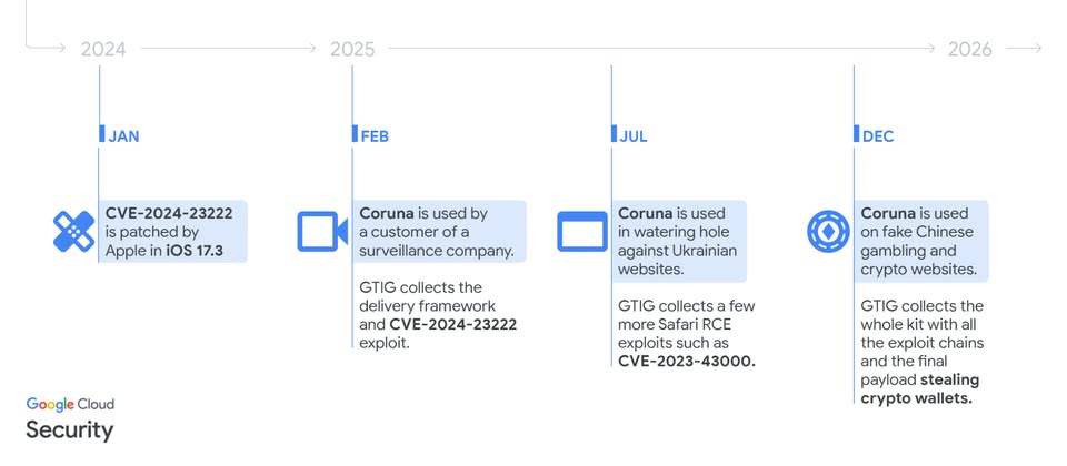 針對此工具包的發現過程,GTIG起初是在2025年2月,看到間諜軟體的客戶用於高度針對性的攻擊活動,後續俄羅斯駭客UNC6353(APT29、Cozy Bear、SVR)於7月,使用該工具包植入烏克蘭網站,對當地的企業組織發動水坑式攻擊。到了去年12月,以經濟利益為動機的中國駭客團體UNC6691將其用於大規模活動,Coruna工具包在大量冒牌金融與加密貨幣網站出現,此時GTIG也取得完整的工具包內容。