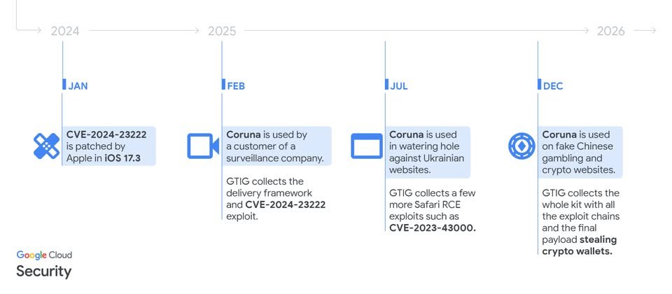 Google威脅情報團隊(GTIG)揭露名為Coruna的iOS漏洞利用工具包,可利用23種已知資安漏洞,並串連出5種完整的漏洞利用攻擊鏈,能針對執行iOS 13.0至17.2.1(分別於2019年9月及2023年12月推出)的iPhone發動攻擊。GTIG強調,此套件的核心價值在於對iOS漏洞的廣泛利用,並採用了非公開的利用技術來繞過相關緩解措施。