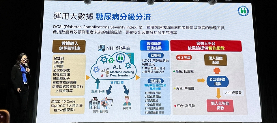 今年,陳亮妤進一步說明模型的預測模式,首先根據健保資料庫數據,如性別、年齡、共病、家族病史、社經資訊、風險因子、檢驗檢查數據等,透過健保雲運算,產出2項預測結果。一是糖尿病風險等級,另一是罹患糖尿病後,可能發生的併發症風險。