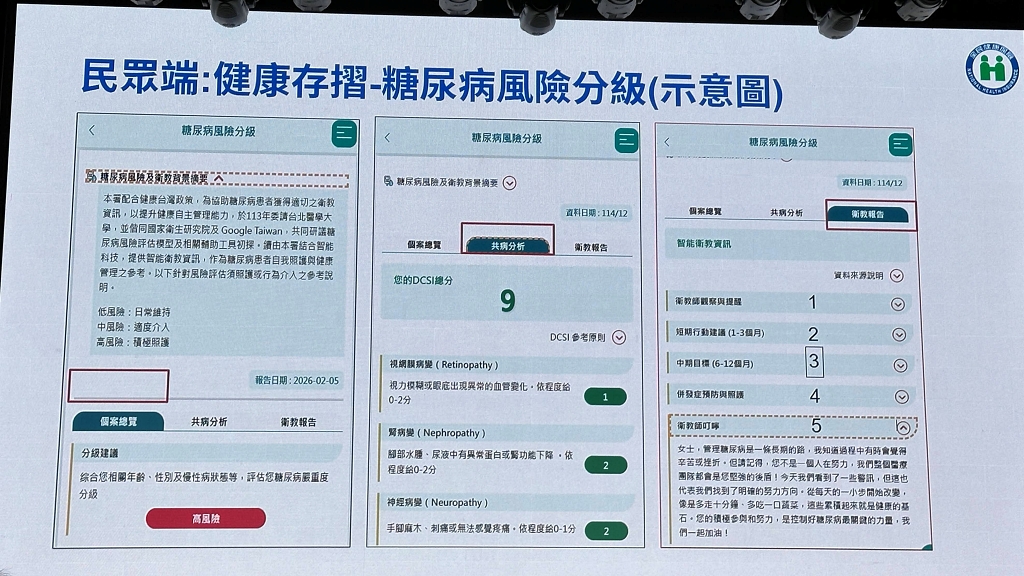 另一項新進展則是健保署將於3月,正式將AI衛教助理上線到健康存摺App中,提供精準衛教給不同風險的民眾,目的是要提高民眾的健康意識、主動把關。