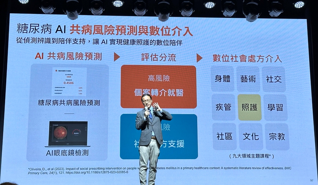 他們的介入方式,是先透過AI模型進行糖尿病共病風險預測,若是高風險患者,就直接轉介就醫。若是低風險患者,則透過社會處方方式介入,來提供9大類課程,如照護、學習、藝術、社交等,其中也包含AI衛教助理,來讓醫療單位的衛教師,對病人或高齡長輩進行衛教說明。