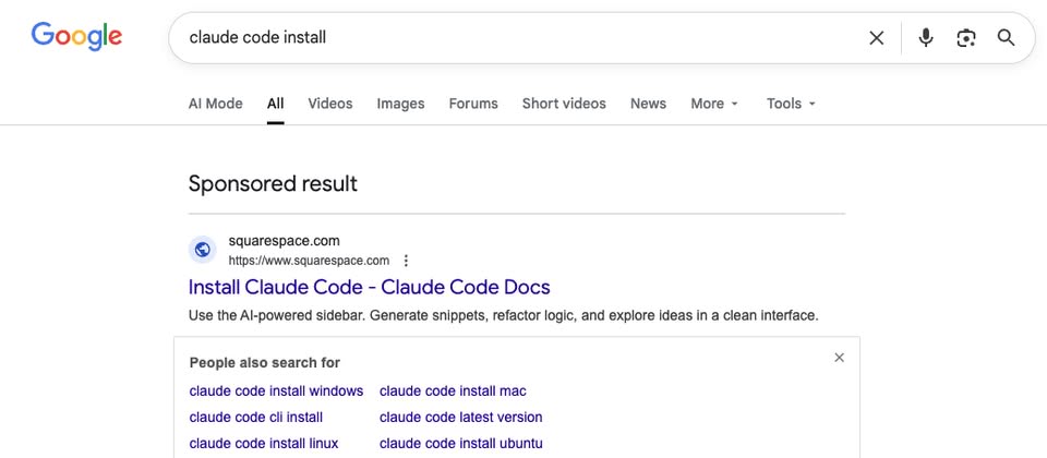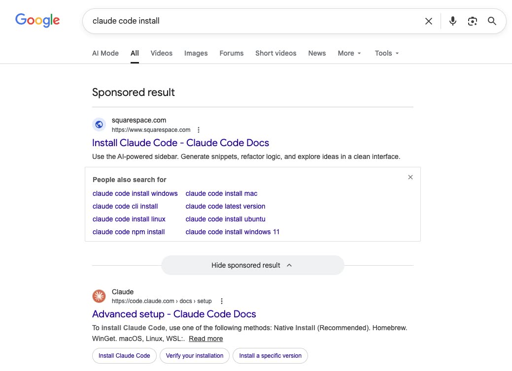 為了讓更多人看到這些偽造頁面,駭客還搭配惡意廣告(malvertising),在用戶搜尋Claude Code、Claude Code install,以及Claude Code CLI等關鍵字時投放廣告,使假網站出現在搜尋結果最前面,藉此增加受害機率。這些惡意網站甚至可能架設在Cloudflare Pages、Squarespace,以及騰訊EdgeOne等合法平臺,以降低被偵測與封鎖的機率。在部分攻擊活動中,受害者最終會被植入名為Amatera Stealer的竊資軟體,該惡意程式源於ACR Stealer。
