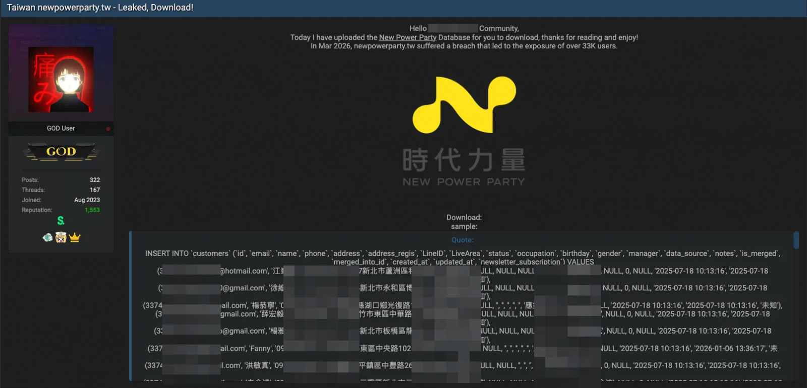 臺灣政黨資安防護亮紅燈!國外資安監控網站The Daily Dark Web近日揭露,臺灣政黨「時代力量(New Power Party)」的資料庫疑似遭到入侵,約3.3萬筆個資已在駭客論壇流出。