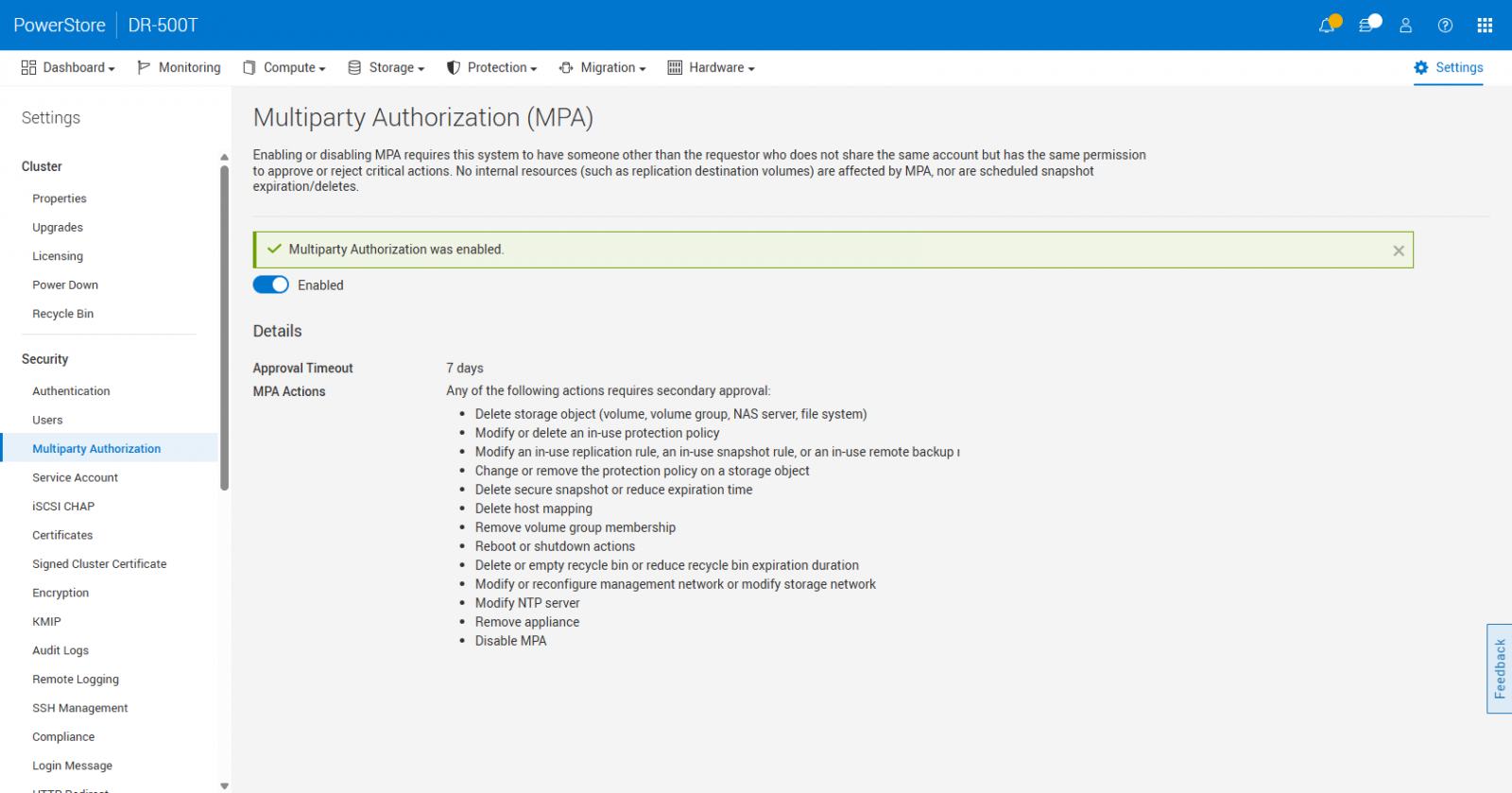 第3, 新增稱為多方授權(Multiparty authorization)的安全性功能,啟用後,某些關鍵操作功能(例如磁碟區刪除),必須經由另一位用戶再次核准,才會實際執行。