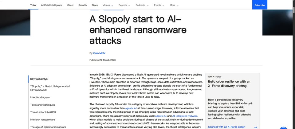年初IBM資安研究團隊X-Force發現疑似由AI生成的C2框架Slopoly,攻擊者的身分是外號Hive0163的駭客組織,他們向來透過勒索軟體Interlock及資料外洩,向受害組織進行勒索。IBM指出,這起攻擊行動的發現,代表駭客組織的攻擊策略出現重大改變,藉由AI輕易在短時間內開發新的惡意軟體或框架。