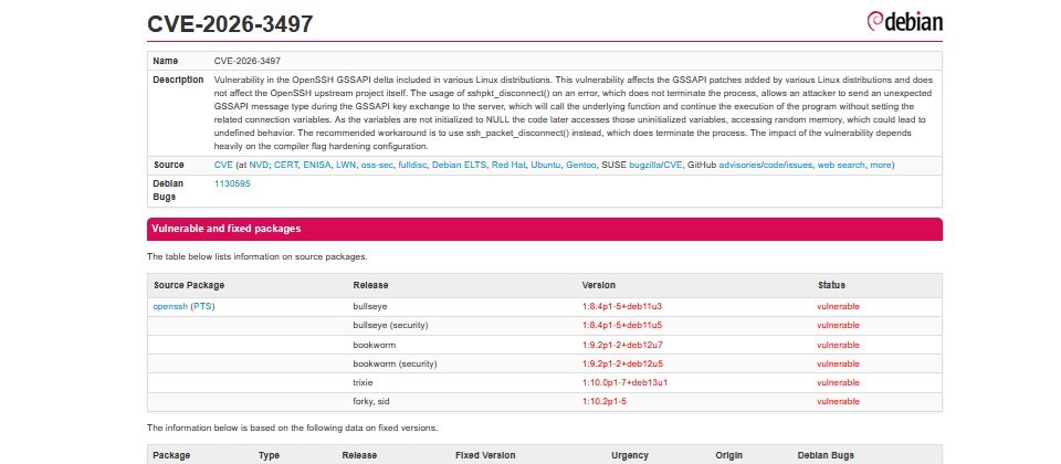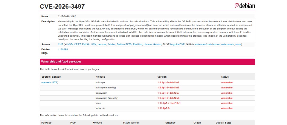 資安研究人員近日揭露Linux常用遠端存取工具OpenSSH存在與GSSAPI(Generic Security Services Application Program Interface)金鑰交換機制相關的漏洞,漏洞編號為CVE-2026-3497,CVSS嚴重性評分6.9,但影響範圍相當大,可能衝擊大量依賴OpenSSH的服務,建議用戶儘速更新。
