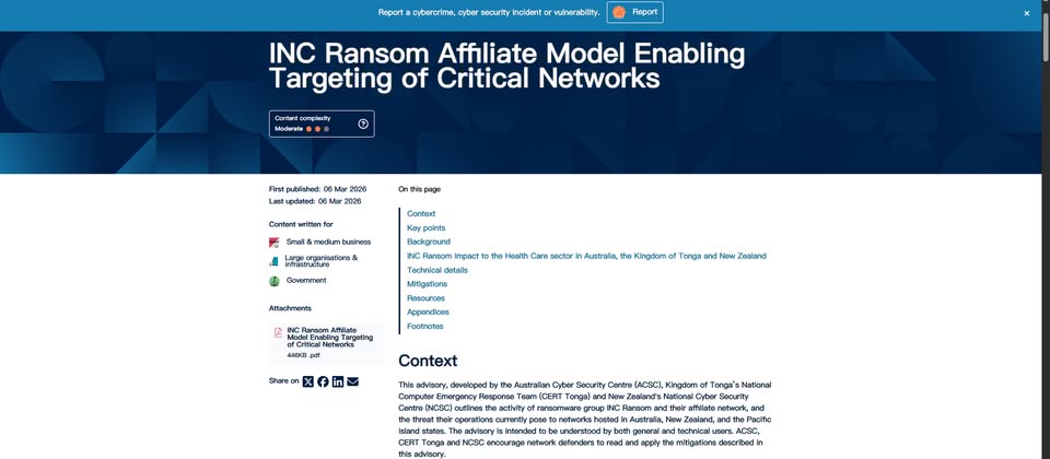 澳洲網路安全中心(ACSC)、東加王國國家電腦緊急應變團隊(CERT Tonga),以及紐西蘭國家網路安全中心(NCSC)最近發布聯合警告,指出過往主要鎖定美國和英國的勒索軟體INC Ransom,以及其附屬團體,自2025年開始,攻擊澳洲、紐西蘭,以及太平洋島國的情況,變得越來越頻繁,而且,有不少攻擊行動是針對醫療照護產業,呼籲相關機構要嚴加防範相關威脅。