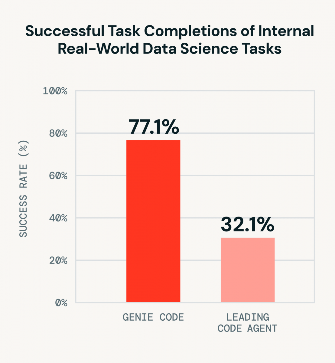 Genie Code支援MCP(Model Context Protocol),可連接Jira、Confluence、GitHub、Google Drive與Notion等外部工具,也可透過Lakehouse Federation存取Databricks外部平臺與內部系統的資料。Databricks提到,在內部真實資料科學任務的基準測試中,Genie Code解題成功率為77.1%,高於另一款搭配Databricks MCP伺服器的領先程式開發代理,後者成功率為32.1%(下圖)。