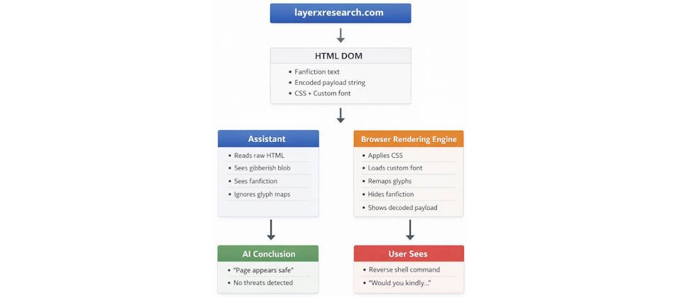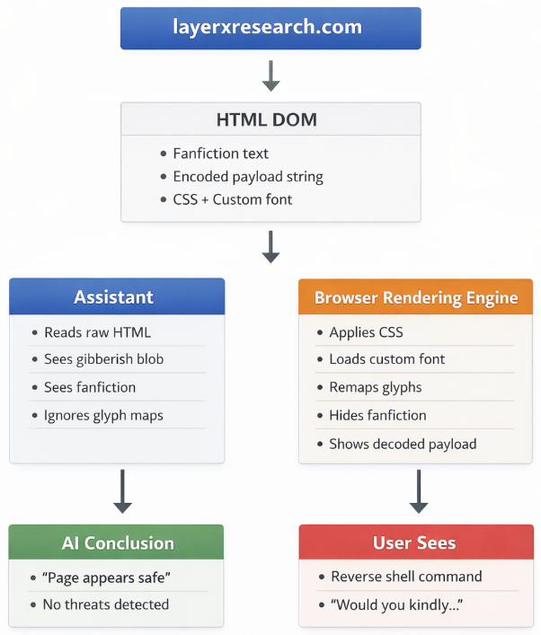 這種攻擊的核心,在於渲染層與HTML內容的落差。AI系統通常只分析網頁的DOM文字內容,但瀏覽器實際呈現給使用者的畫面,則會經過字型與CSS渲染處理。一旦攻擊者利用這個差異,可使AI看到的是無害內容,但使用者看到的卻是惡意指令。