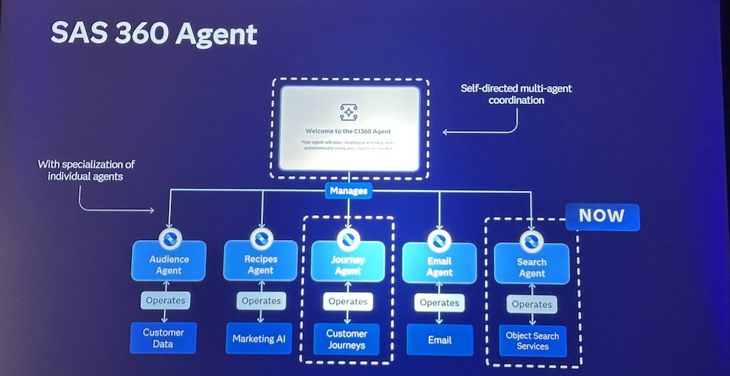 不只如此,SAS的AI代理佈局也擴大到行銷領域,在大會上宣布擴充行銷平臺SAS Customer Intelligence 360的AI代理能力,提供多個專屬AI代理來自動化特定行銷工作流程,包括在既有的受眾管理、顧客旅程、決策執行等作業流程,擷取正確的資料物件、給建議並加速執行,所有關鍵節點都保留人工確認機制。