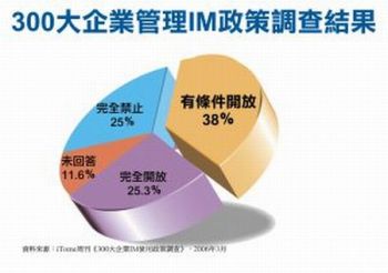 根據iThome針對前300大企業使用即時通訊的現狀調查中發現,目前企業是以有條件開放使用即時通訊的企業最多,整體占38%,各產業分別為服務業有30%、金融業占40%、製造業占44%。這數據也顯示這一些大企業中,已經有許多企業對於即時通訊管理的意識開始抬頭,在開放與不開放的中間,選擇了折衷的辦法。