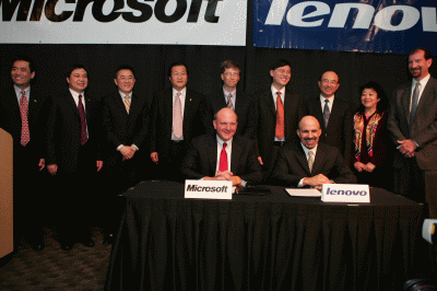 中國聯想集團(Lenovo Group)與微軟於周一(4/17)簽署合作協議,旗下所有個人電腦將預裝微軟授權的Windows作業系統,雙方也將共同銷售、行銷,以及推廣正版軟體。