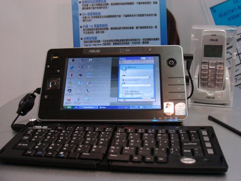 華碩展出這台UMPC,只有7吋螢幕大小,重量為870克,以觸控方式輸入,採用英特爾ULV Celeron M處理器,時脈為900MHz,並且內建768MB DDR2記憶體與60GB硬碟,配備802.11a/b/g無線網路與可辨識達到真皮層的紅外線指紋辨識系統、130萬畫素攝影機,重量為870公克,售價約為36800元。右邊則是可搭配使用的無線Skype話機。