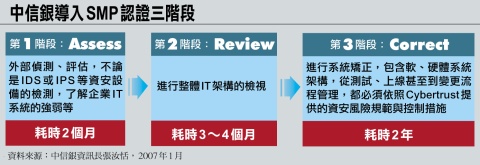 中信銀開始導入Cybertrust的資安顧問服務,分成3階段進行。其中,最難的系統矯正階段,總計耗時2年。張汝恬指出,包含分行上千臺用戶端電腦,超過500臺伺服器,300多個子系統等,每一個系統從測試、上線甚至到變更流程管理, 都必須依照Cybertrust提供的資安風險規範與控制措施,進行系統矯正,某些時候,系統甚至得重新開發才行。經歷偵測、檢視和系統矯正等3階段,一直到2006年初,中信銀針對包含金融資訊系統、網路架構、設施及安全管理等面向,進行資安風險總體檢,並於年底取得SMP企業安全管理認證。目前,中信銀也是北亞區唯一取得SMP認證的企業。