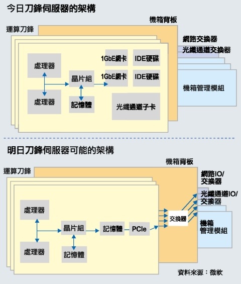| 微軟在WinHEC 2005與2006,連二年討論未來刀鋒伺服器的發展架構,如下圖所示,微軟認為未來的刀鋒伺服器會整合PCIe及I/O虛擬化技術,如此可簡化刀鋒刀板的架構,以及提供更彈性的系統配置與管理功能。但是,目前刀鋒伺服器廠商並不完全認同此一趨勢。 |