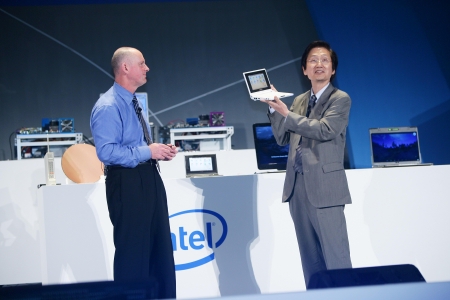 英特爾執行副總裁馬宏昇(Sean Maloney)的專題演講上,華碩董事長施崇棠手拿白色Eee PC 701上台,兩人聯袂發表這款199美元筆電。(圖片提供:英特爾)