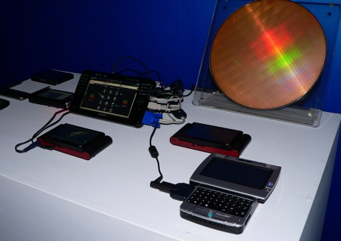 在專題演講現場,英特爾展示出多家硬體廠商所設計生產的行動上網裝置(Mobile Internet Devices, MID)及超行動電腦(Ultra-Mobile PC, UMPC)。(右後方的圓盤為45nm製程的晶圓)