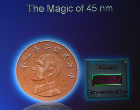 以45nm製程所產出的裸晶(die)大約只比筆尖略大一些(圖中每一方格即為一個裸晶)。比一元硬幣還小的Silverthorne處理器