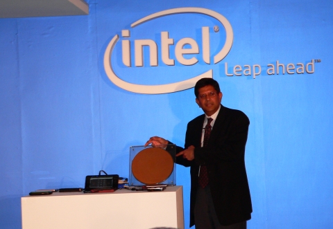 Chandrasekher以實際的晶圓說明英特爾的45nm製程產品。