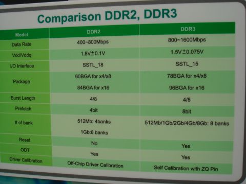 與記億體相關的,下一代PC的主記憶體標準DDR3也隨著英特爾新晶片組發表成為各家業者展出重點,圖為業者說明與前一代記憶體規格之優劣。