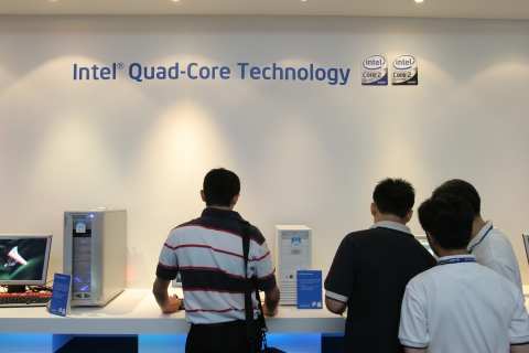先推出四核心的英特爾配合此次發表新晶組,現場展示多台桌上型電腦。