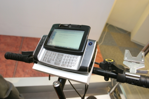 圖為國內業者奐億所開發的英特爾MID產品,4.8吋的螢幕可上下滑動,重量在1公斤以內,英特爾訴求在這樣的小機身下提供多種無線上網功能。圖為附在腳踏車上的MID,強調行動性。