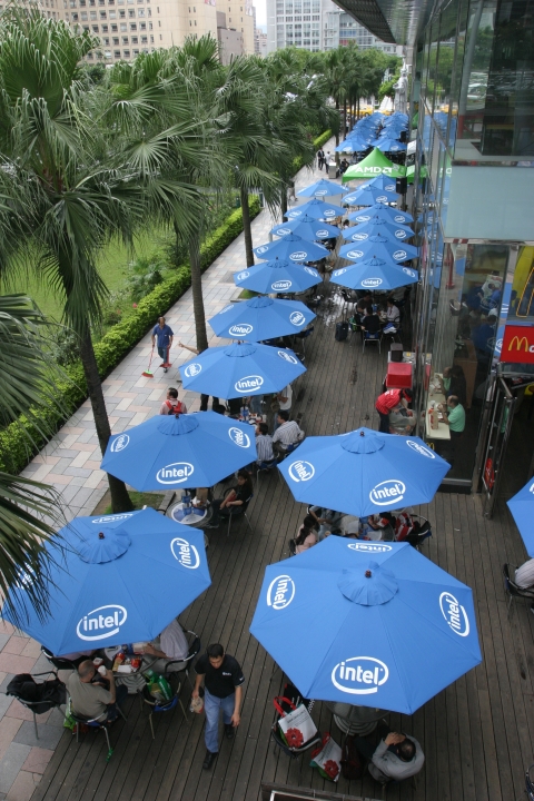 展場之外的巨大戶外型遮陽傘也成為英特爾的行銷宣傳,萬藍叢中一點綠看起來突兀,其實在另一邊超微也擺設巨大超微遮陽傘陣。