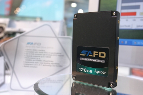 今年以快閃記憶體技術為儲存基礎的固態硬碟(SSD)在電腦展中發燒,圖為Apacer所展出的SATA 介面128GB容量產品。
