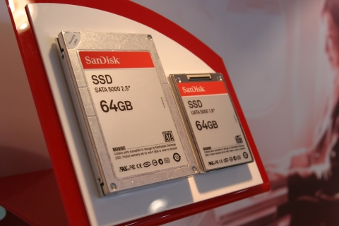 跑較快的SanDisk也在會場展示剛發表的64GB SATA介面SSD。左為2.5吋硬碟,右為1.8吋。
